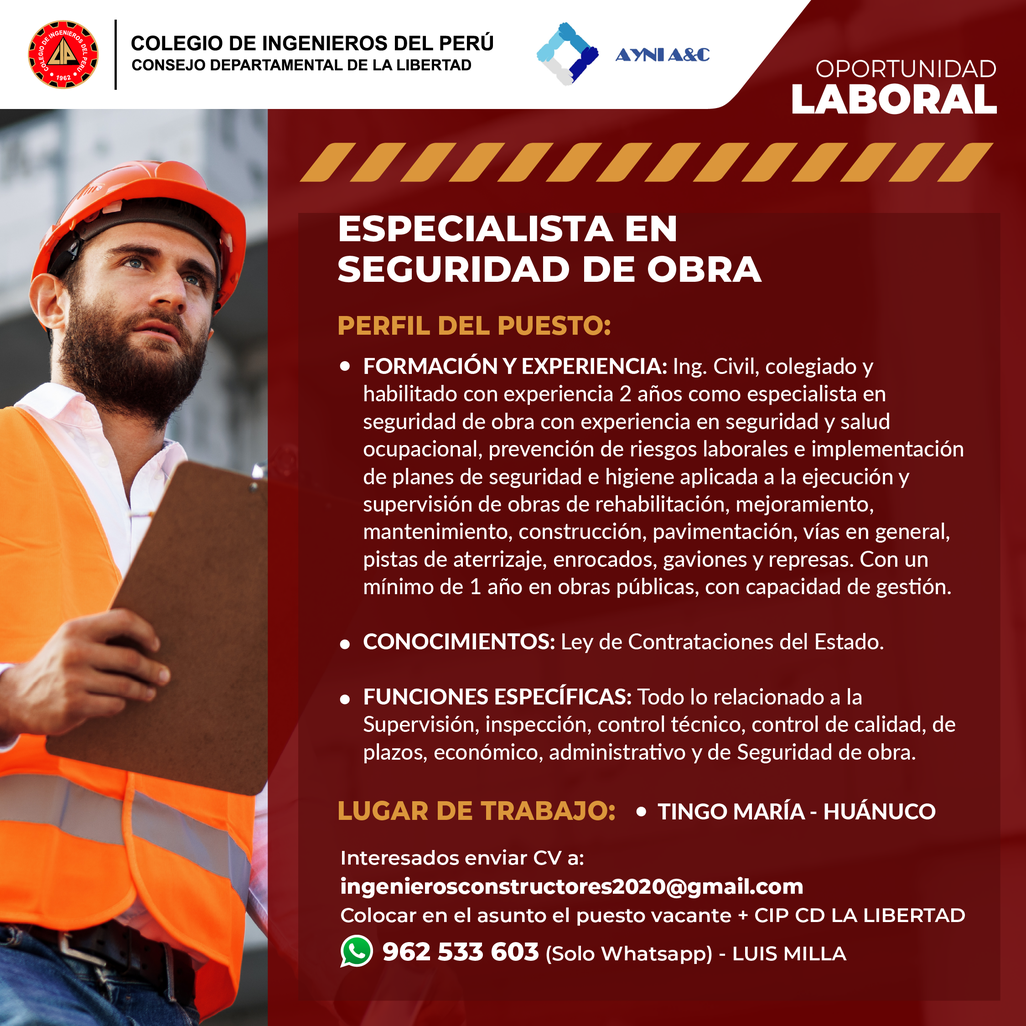 𝐂𝐎𝐍𝐕𝐎𝐂𝐀𝐓𝐎𝐑𝐈𝐀 𝐋𝐀𝐁𝐎𝐑𝐀𝐋 - Especialista en seguridad de obra.